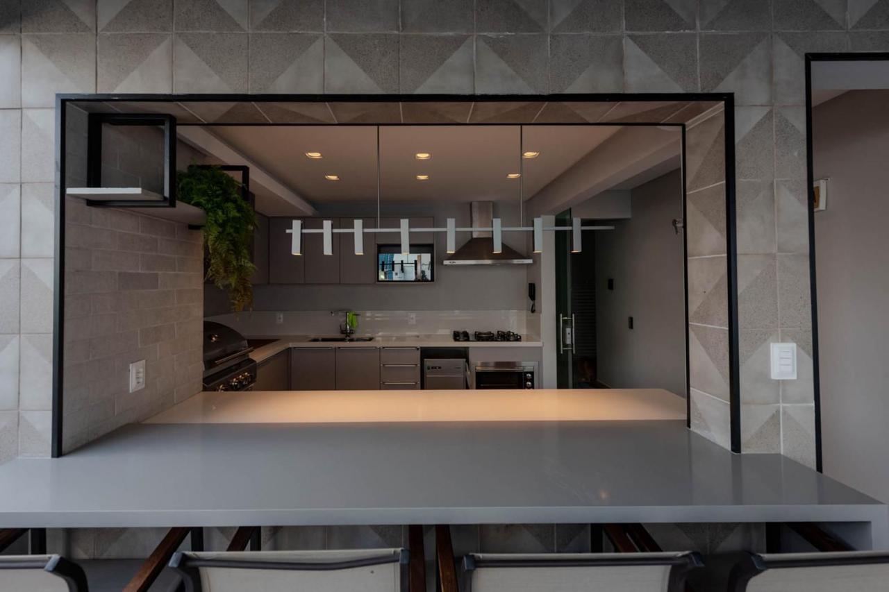 A cozinha, totalmente equipada, conecta-se de forma prática à churrasqueira a carvão — ideal para quem gosta de receber.